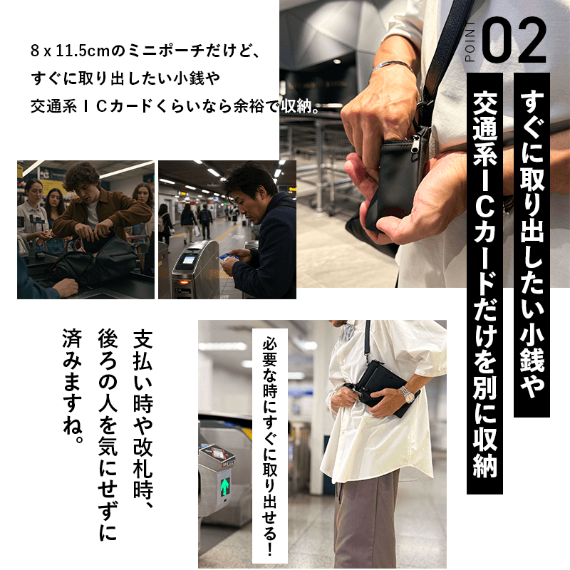 支払い時や改札でモタつかない。交通系ICカード・小銭・イヤホン・スマートキーなど、よく使う小物だけをスマートに分けて収納!
