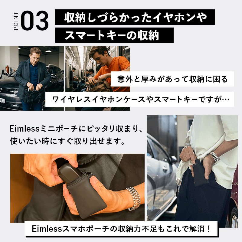 厚みが気になるワイヤレスイヤホンケースやスマートキーもぴったり収まる設計。使いたい時にすぐアクセスできます。 ※Eimlessスマホポーチと組み合わせれば、収納力を手軽に拡張できます。