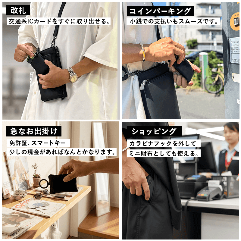 ・ショッピング:カラビナを外せばミニ財布としても使えます。